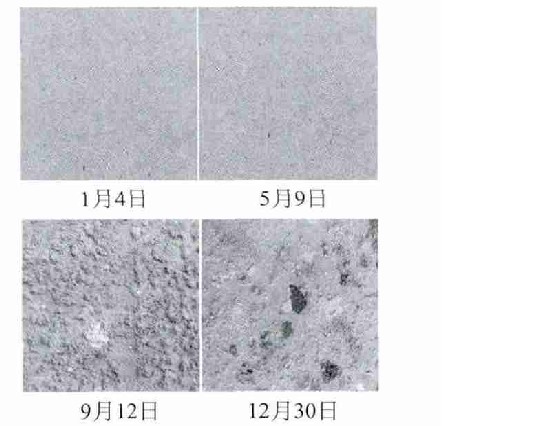 試驗(yàn)材料為綠洲森工有限公司提供的干燥狀態(tài)下使用的家具用中密度板 (MDF-FN REG) , 規(guī)格2 440 mm×1 220 mm×15 mm, 生產(chǎn)日期為2015-12-26, 一個(gè)批次共4張。試驗(yàn)材料均勻靜置于倉(cāng)庫(kù)避光陰涼處, 從2016-01-04儲(chǔ)存至2016-12-30。儲(chǔ)存期間, 倉(cāng)庫(kù)中溫濕度隨自然條件變化而變化, 在高溫高濕的梅雨季節(jié), 由于具有較強(qiáng)的吸濕性, 中密度板含水率大幅增加從而發(fā)生霉變腐朽。中密度板在不同時(shí)間表面外觀情況見圖1。
