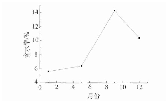 通過試驗(yàn)和計(jì)算得出:1月、5月、9月、12月, 含水率分別為:5.6%、6.4%、14.3%、10.4%。以月份為橫坐標(biāo), 含水率值為縱坐標(biāo)繪制含水率隨時(shí)間變化趨勢(shì)見圖2。