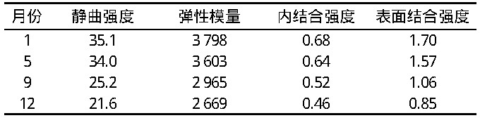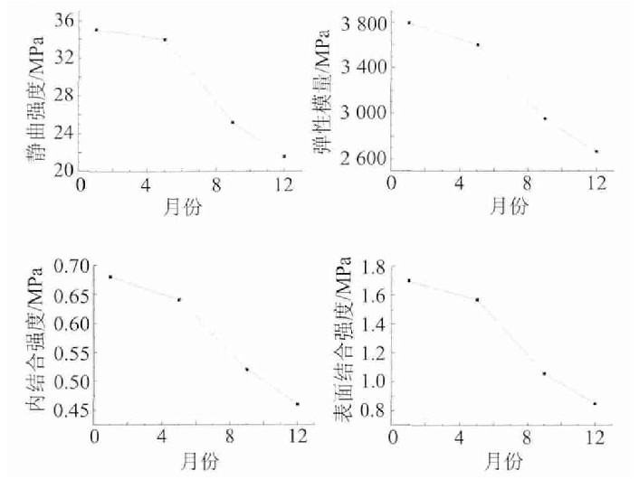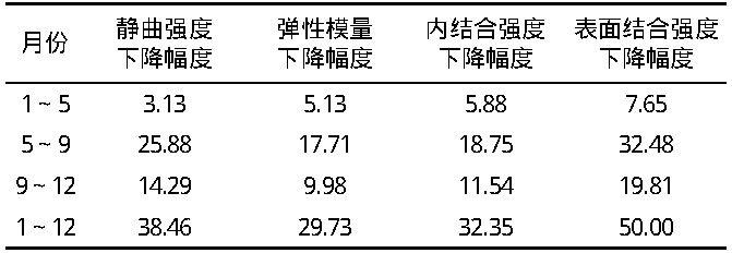 由圖3可見, 中密度板的靜曲強(qiáng)度、彈性模量、內(nèi)結(jié)合強(qiáng)度、表面結(jié)合強(qiáng)度力學(xué)性能呈相同變化規(guī)律, 即在1~5月下降幅度較小, 5~9月下降幅度較大, 9~12月下降幅度趨緩。1~5月中密度板表面未見明顯的霉變, 其力學(xué)性能下降幅度較小;5~9月中密度板經(jīng)歷黃梅季節(jié)后發(fā)生霉變, 其力學(xué)性能下降幅度較大;9~12月中密度板表面霉菌群衰敗, 其力學(xué)性能下降幅度趨緩。
