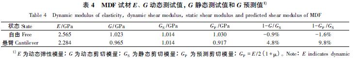 據(jù)3.3 泊松比動態(tài)測試值為0.245,關(guān) 于彈性模量和剪切模量取值,從它們在不同 長寬比下測試值取其平均值考慮,在自由約 束狀態(tài)E = 2.565 GPa,G = 1.023 GPa; 而懸 臂約束狀態(tài)E = 2.284 GPa,G = 0.965 GPa。 方板靜態(tài)扭轉(zhuǎn)試驗測試的MDF 的靜剪切模 量G= 1.014 GPa。從表4 可知,自由狀態(tài)動 態(tài)測試的彈性模量大于懸臂狀態(tài)測試的彈性模量; 自由和懸臂狀態(tài)測試的動態(tài)剪切模量與靜態(tài)測試的剪 切模量相對誤差小于5%; 根據(jù)E 和μ 測試值按各向同性材料E、G 和μ 滿足的關(guān)系式G =E /2( 1+μ) 計算的剪切模量預(yù)測值,其與剪切模量靜態(tài)測試值的相對誤差: 對于自由約束狀態(tài)不大于2%,而對于懸臂狀 態(tài)不大于10%,改善懸臂狀態(tài)會減少這種誤差,從而可近似地將MDF 按各向同性材料處理,可稱為準(zhǔn)各 向同性材料。