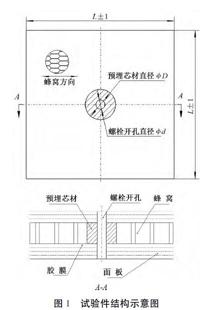 復(fù)合材料蜂窩夾層結(jié)構(gòu)一般由上下面板、芯材、粘接層等組成,其上鑲嵌有埋件,形成傳力接頭。埋件結(jié)構(gòu)是結(jié)構(gòu)設(shè)計(jì)中廣泛使用的連接形式,是蜂窩結(jié)構(gòu)與其他結(jié)構(gòu)連接時(shí)的主要受力部件。根據(jù)制備工藝的不同,埋件分為預(yù)埋件和后埋件,埋件多使用金屬埋件,多采用后埋工藝。目前埋件夾層結(jié)構(gòu)的破壞機(jī)理尚不明確,埋件的拉脫強(qiáng)度一般通過(guò)試驗(yàn)獲得。